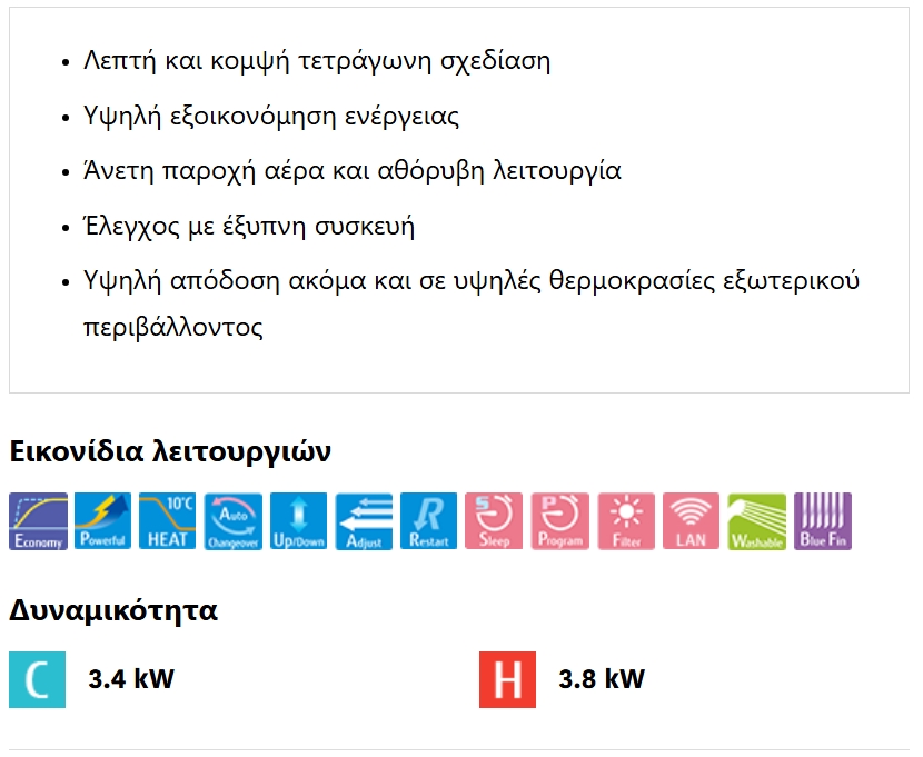 Χάρη στη χρήση του εναλλάκτη θερμότητας Lambda υψηλής απόδοσης, του μεγάλου ανεμιστήρα εγκάρσιας ροής και του ψυκτικού μέσου R32 επιτυγχάνεται εξαιρετική ενεργειακή απόδοση παρά το συμπαγές μέγεθος της εσωτερικής μονάδας.