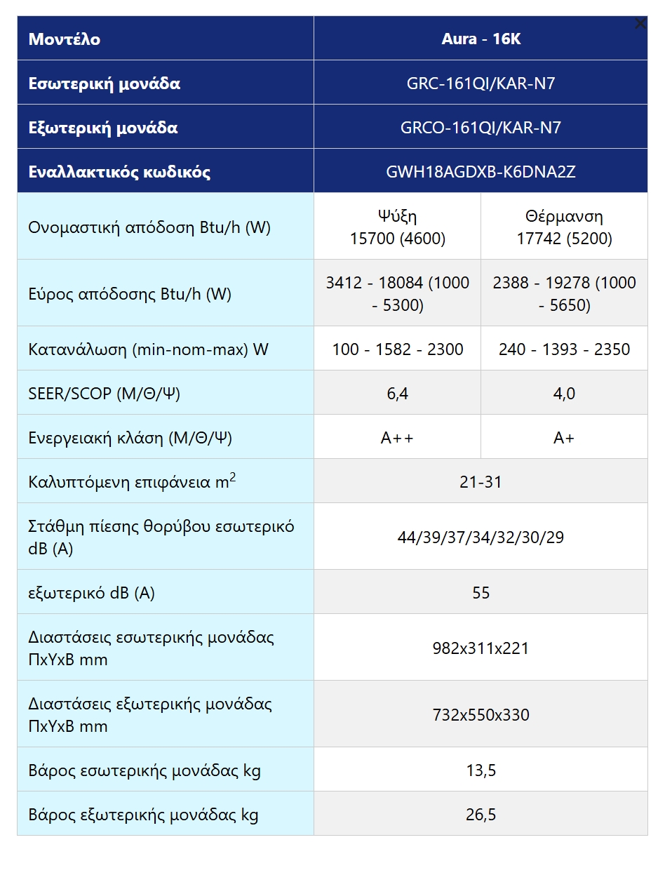 ΚΛΙΜΑΤΙΣΤΙΚΟ GREE ΣΕΙΡΑ AURA GRC-161QI/KAR-N7 / GRCO-161QI/KAR-N7 A+++ R-32 ΕΩΣ 12 ΑΤΟΚΕΣ ΔΟΣΕΙΣ ΜΕ ΠΙΣΤΩΤΙΚΗ Ή ΕΩΣ 60 ΔΟΣΕΙΣ ΜΕ ΤΡΑΠΕΖΙΚΟ ΠΛΑΝΟ ΔΟΣΕΩΝ