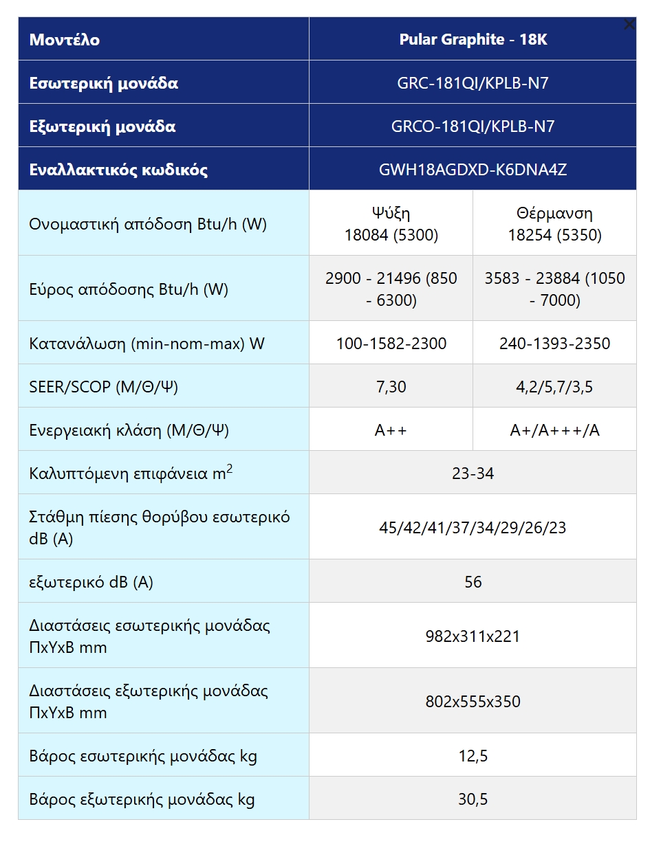 ΚΛΙΜΑΤΙΣΤΙΚΟ GREE ΣΕΙΡΑ PULAR GRAPHITE GRC-181QI/KPLB-N7 / GRCO-181QI/KPLB-N7 A++ R-32 ΕΩΣ 12 ΑΤΟΚΕΣ ΔΟΣΕΙΣ ΜΕ ΠΙΣΤΩΤΙΚΗ Ή ΕΩΣ 60 ΔΟΣΕΙΣ ΜΕ ΤΡΑΠΕΖΙΚΟ ΠΛΑΝΟ ΔΟΣΕΩΝ