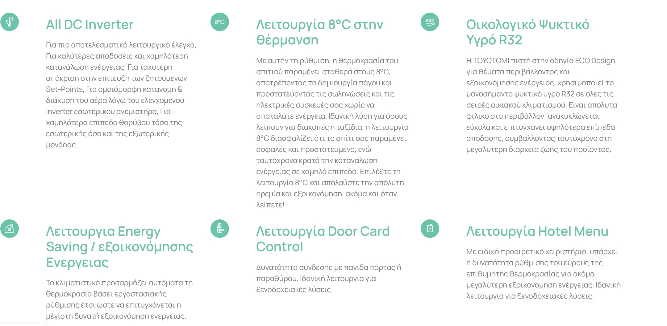 Η σειρά κλιματιστικών Toyotomi Kenzo διακρίνεται για το μοντέρνο σχεδιασμό της, τις υψηλές αποδόσεις, τη χαμηλή κατανάλωση καθώς και τις πολλαπλές λειτουργίες που διαθέτει με σκοπό να δημιουργεί το ιδανικό κλίμα κάθε εποχή και με τον πιο οικονομικό τρόπο.