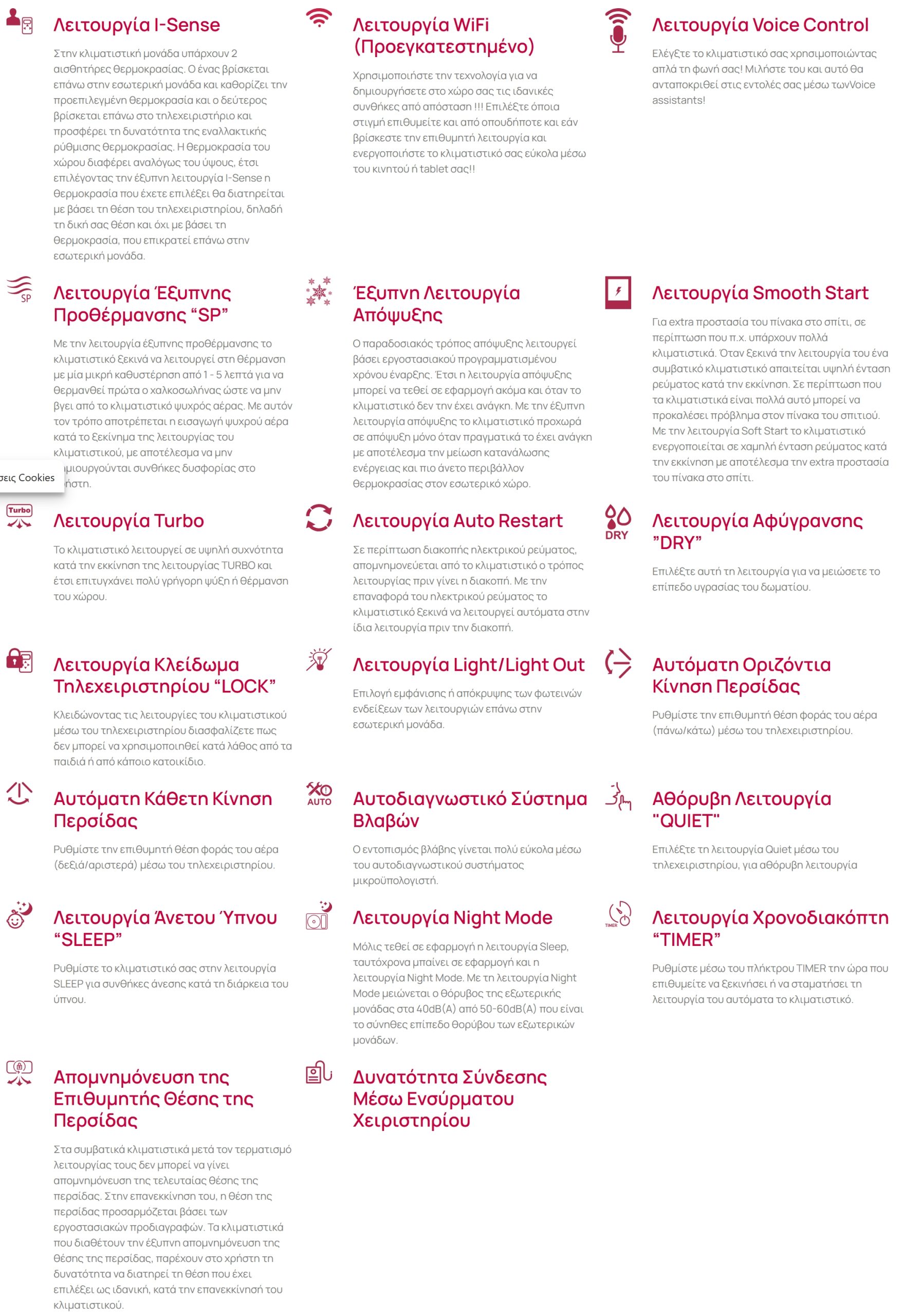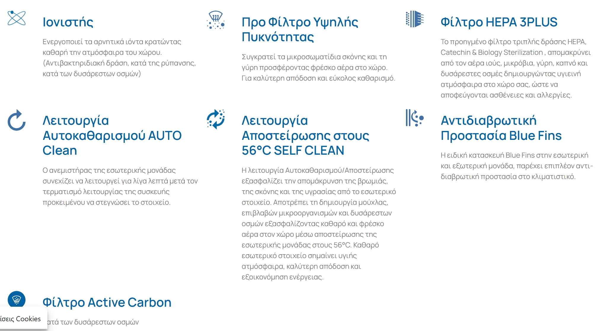 Ο Ιονιστής, το ενισχυμένο τριπλό φίλτρο Hepa 3PLUS (Hepa / Biology Sterilization / Catechin), το φίλτρο Active Carbon καθώς και οι λειτουργίες αποστείρωσης Self Clean στους 56°C και αυτοκαθαρισμού Autoclean φροντίζουν για την καθαρή και υγιεινή ατμόσφαιρα του χώρου.